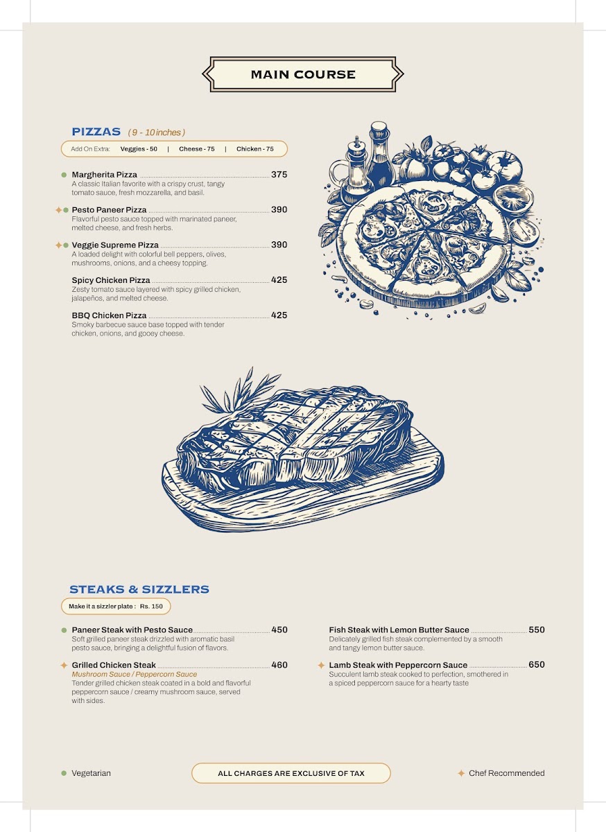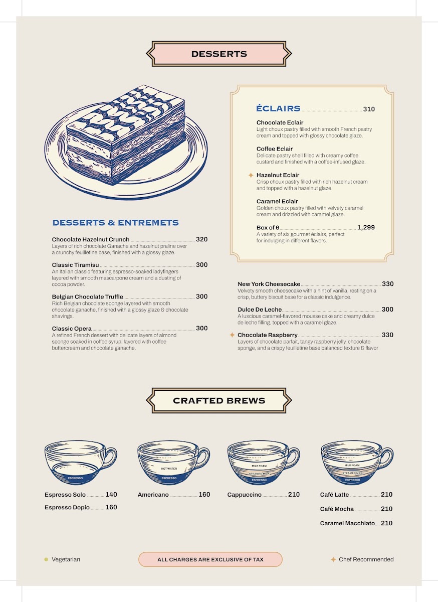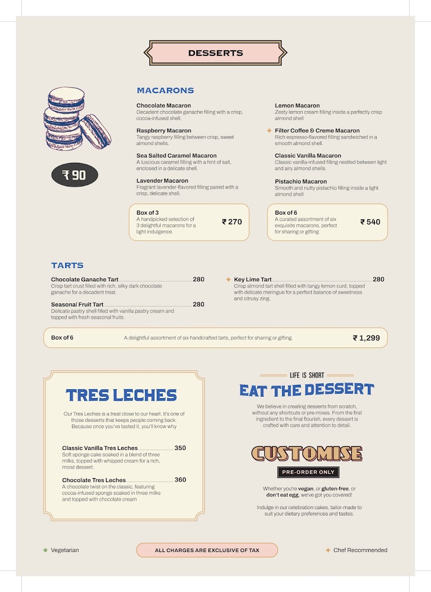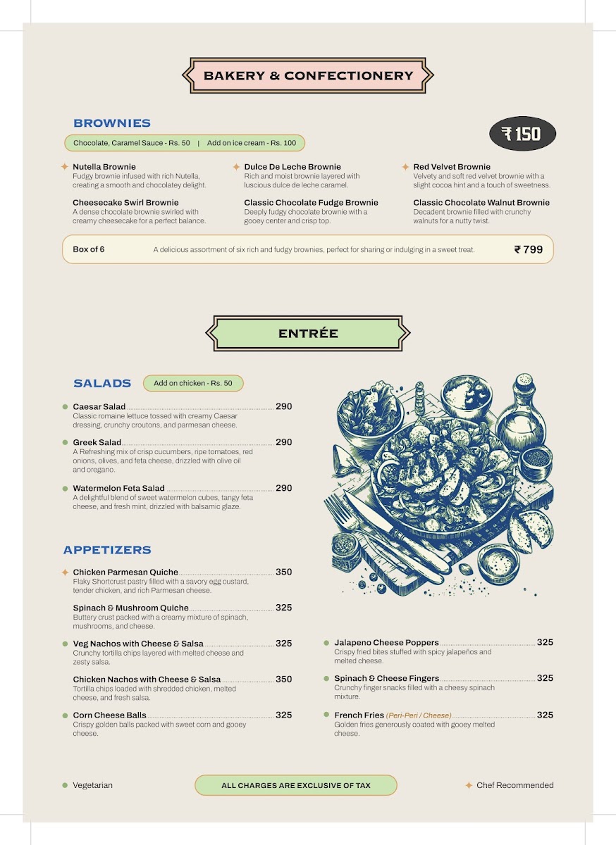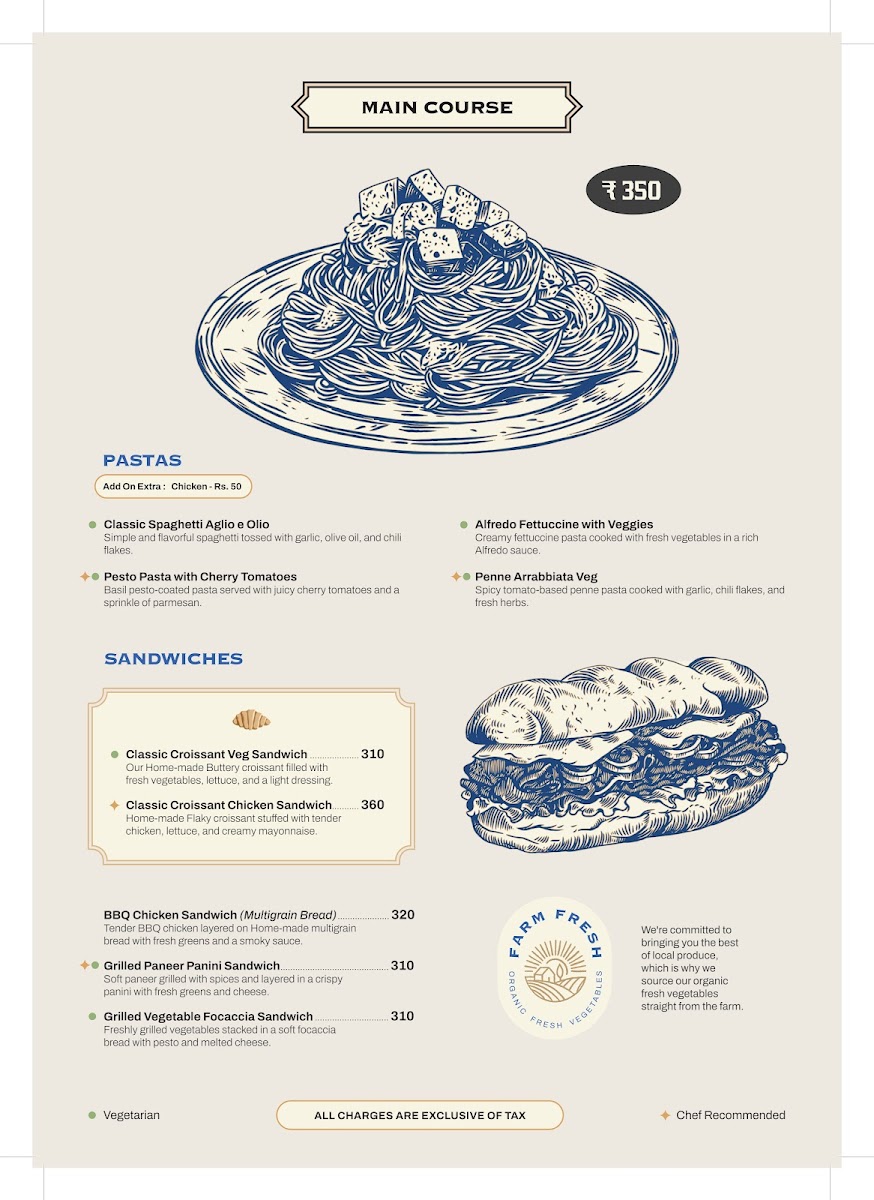 The menu boasts an array of delectable options that cater to both savory and sweet cravings. For pasta lovers, the Classic Spaghetti Aglio e Olio offers a simple yet flavorful experience with its garlic and chili flakes, setting the tone for comfort food at ₹350. The Pesto Pasta with Cherry Tomatoes, dressed in a fragrant basil pesto and paired with juicy tomatoes, is another crowd-pleaser at the same price. If you’re in the mood for something creamy and satisfying, the Alfredo Fettuccine with Veggies is a delightful option that comes loaded with fresh vegetables, also priced at ₹350.